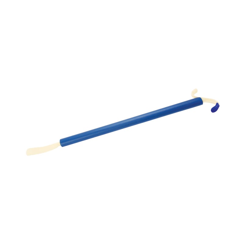 Designed with a plastic push-pull S-Hook at one end and a long handled shoe horn at the other end. A large comfortable foam grip covers the handle. 30" long.