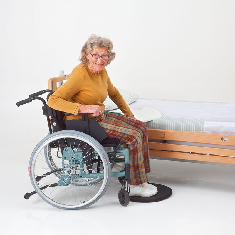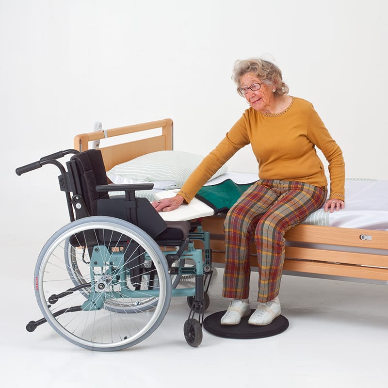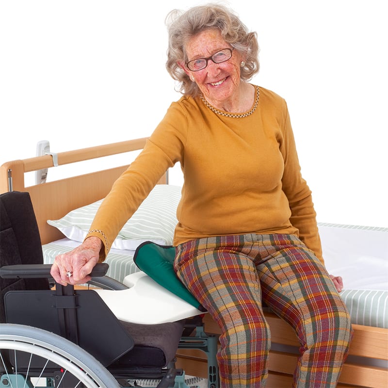 Designed with cutouts to position to the wheelchair’s wheels. The non-slip areas on the underside prevent the board from sliding out of position. The smooth surface allows easy sliding transfer.