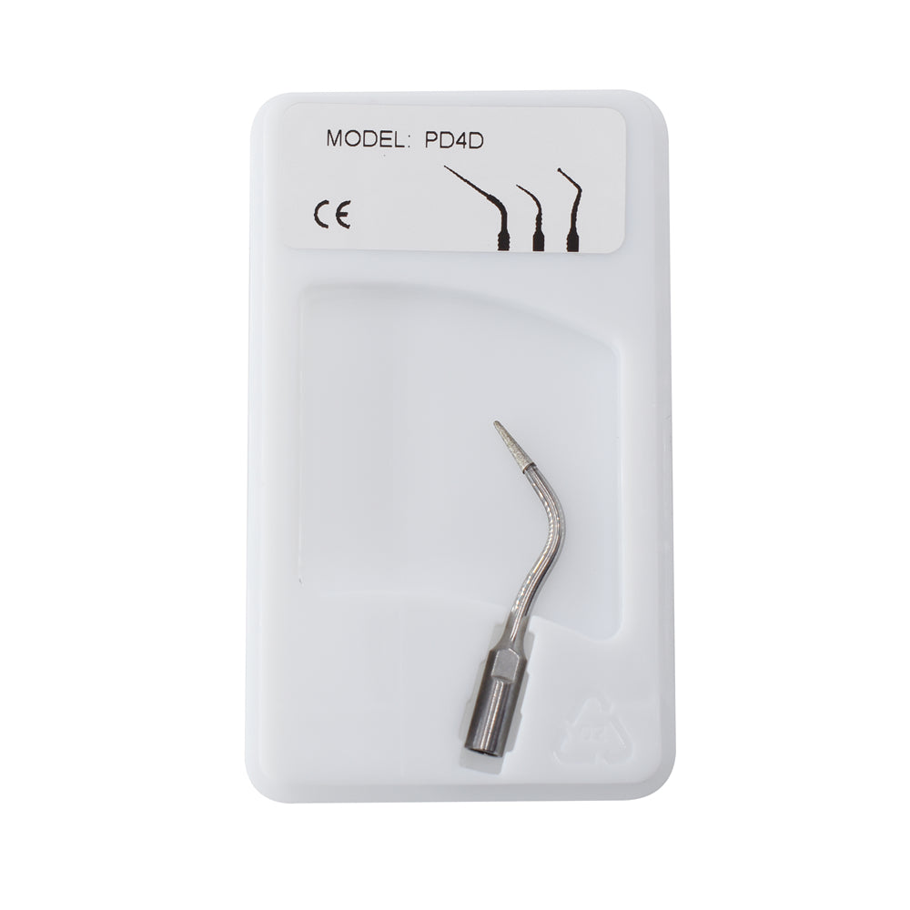 PD1 with water (Perio scaling tip) Remove subgingival calculus. PD3 with water (Perio scaling tip) Remove subgingical and deep perio calculus. PD4 with water (Perio scaling tip) Remove subgingival calculus. PD3D with water (Perio treatment tip) Level off the surface of root during the periodontal falp surgery. Diamond coated PD4D with water (Endo tip) Replace the traditional reamer, used for preparing good endo jaws. Diamond coated |